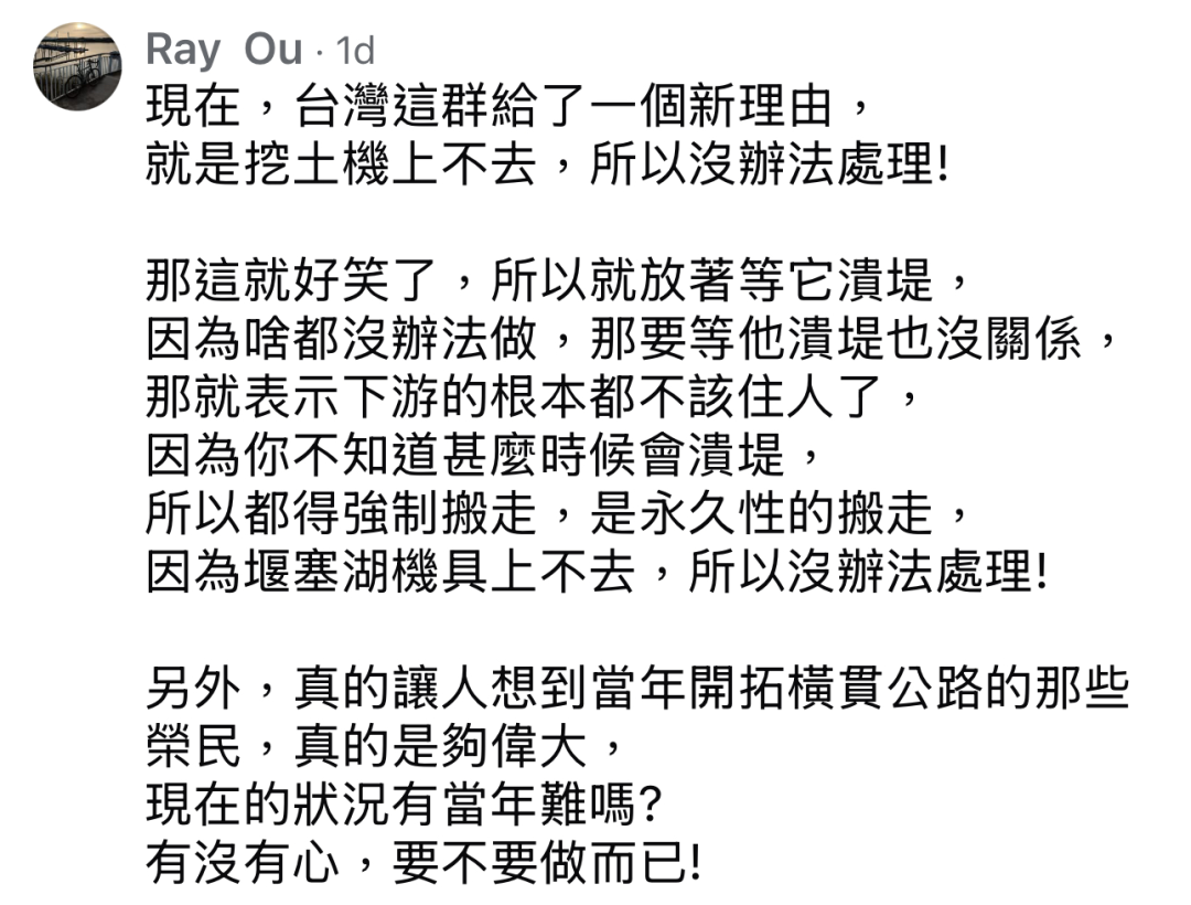 言下之意,就是马太鞍溪堰塞湖体量庞大,爆破处理不仅技术难度高,无法可治,唯有下游民众自求多福,逃得比洪水快。
