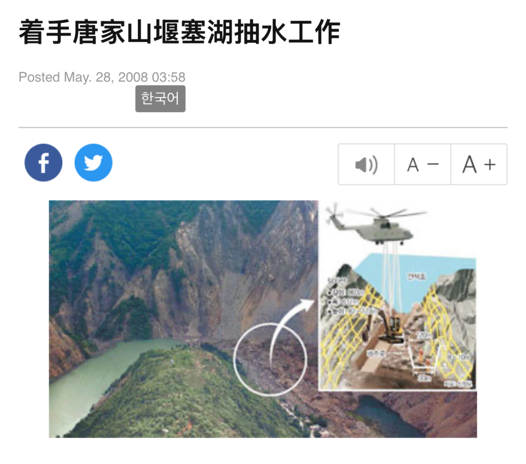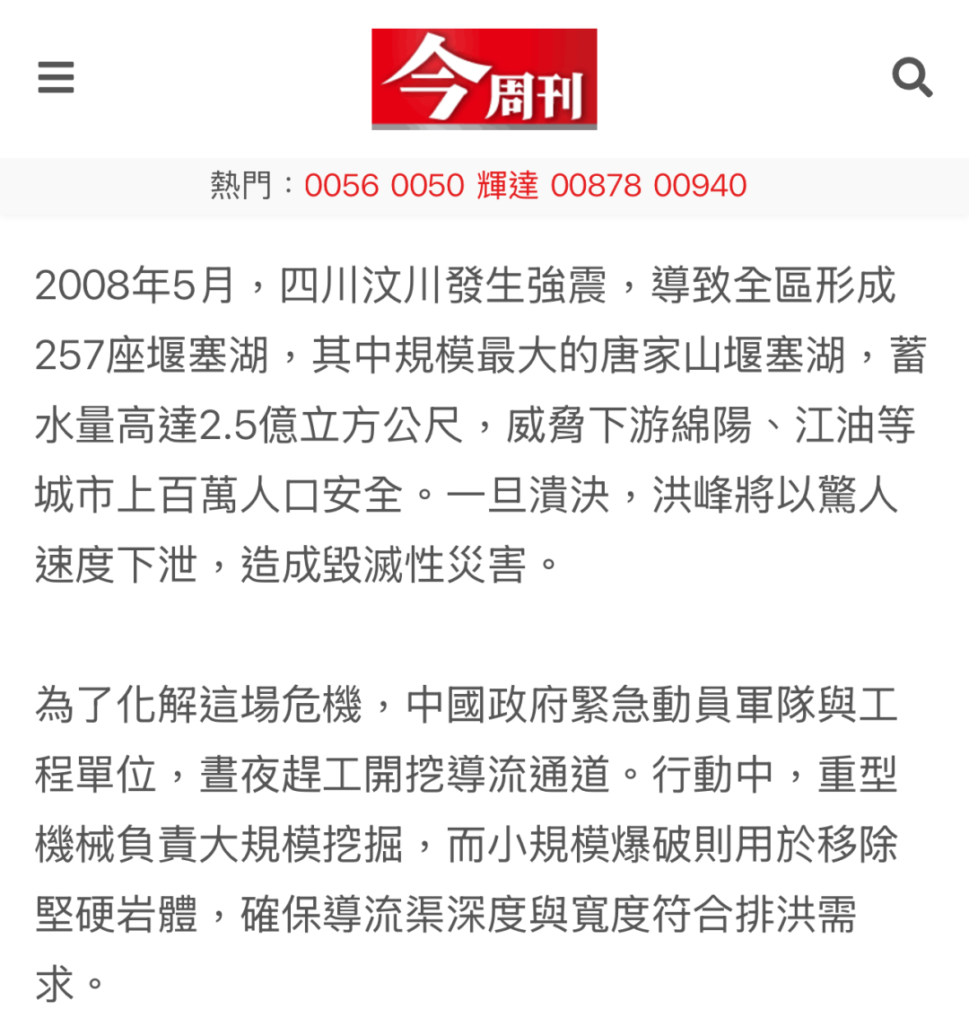 这个“教科书级别”的案例,就是2008年5月12日四川省汶川地震后,所形成的“唐家山堰塞湖”。拥有3.2亿立方米蓄水量的唐家山堰塞湖,体量是花莲堰塞湖的3倍以上,周边地质结构相似,下游更有上百万人口被威胁。