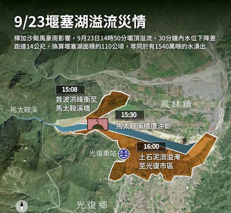 9月22日,花莲地区进入暴雨范围,经过一日冲刷后,23日花莲南边的一处名为“马太鞍溪”的河流水位暴涨,灌入一处堰塞湖,导致堰塞湖超出承受极限而溢流,进而溃堤。