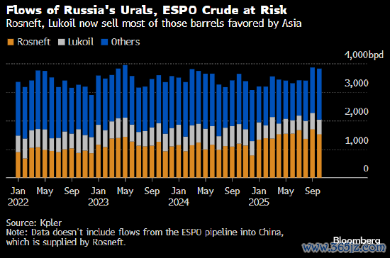 分析公司Kpler的数据显示,目前约有4800万桶俄罗斯石油公司和卢克石油公司的原油(主要为乌拉尔和ESPO等级)正在运输途中或即将装载。这其中包括约50艘驶往印度的油轮,但也包括一些没有目的地或驶往较小港口的油轮,这些油轮分散在从波罗的海到南海,中间商正在逐步退出这些原油贸易。