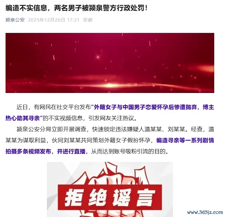 颍泉公安分局立即开展调查,快速锁定违法嫌疑人温某某、刘某某。经查,温某某为谋取利益,伙同刘某某共同策划外籍女子假扮怀孕,编造寻亲等一系列剧情拍摄多条视频发布,并进行直播,从而达到账号吸粉引流的目的。温某某、刘某某利用公众猎奇心理及助困助难的善意,无底线博眼球、蹭流量,编造不实信息,扰乱公共秩序,造成严重社会影响。近日,公安机关已依法对温某某、刘某某行政处罚。